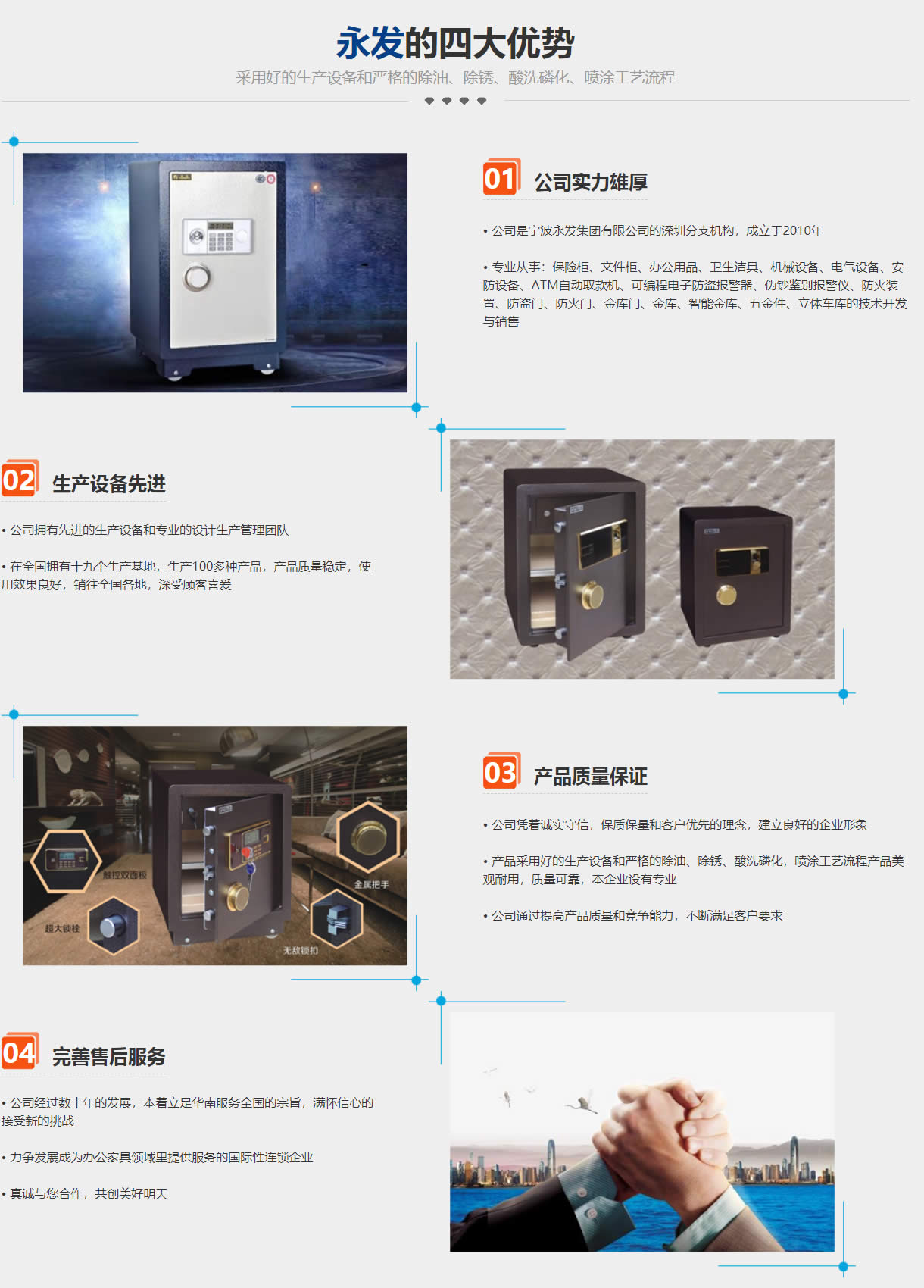 深圳永發(fā)安防產(chǎn)品有限公司 深圳永發(fā)安防產(chǎn)品有限公司,是寧波永發(fā)集團(tuán)有限公司的深圳分支機(jī)構(gòu),成立于2010年,專業(yè)從事:保險柜、文件柜、辦公用品、衛(wèi)生潔具、機(jī)械設(shè)備、電氣設(shè)備、安防設(shè)備、ATM自動取款機(jī)、可編程電子防盜報警器、偽鈔鑒別報警儀、防火裝置、防盜門、防火門、金庫門、金庫、智能金庫、五金件、立體車庫的技術(shù)開發(fā)與銷售。